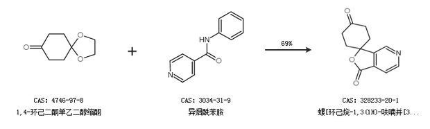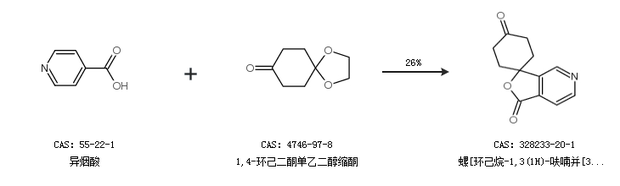2.通过异烟酸和1,4-环己二酮单乙二醇缩酮合成螺[环己烷-1,3(1H)-呋喃并[3,4-c]吡啶]-1,4-二酮,收率约26%;