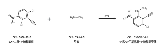 1.通过2,6-二氯-3-硝基苯肼和甲胺合成6-氯-2-甲基氨基-3-硝基苯甲腈,收率约96%;