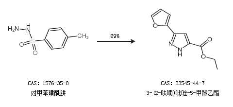 1.通过对甲苯磺酰肼合成3-(2-呋喃)吡唑-5-甲酸乙酯,收率约69%;