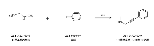 1.通过N-甲基炔丙基胺和碘苯合成1-(甲基氨基)-3-苯基-2-丙炔,收率约82%;