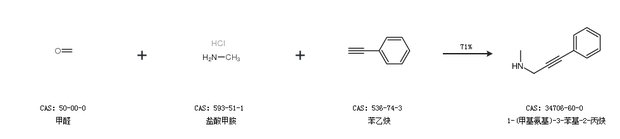 2.通过甲醛、盐酸甲胺和苯乙炔合成1-(甲基氨基)-3-苯基-2-丙炔,收率约71%;