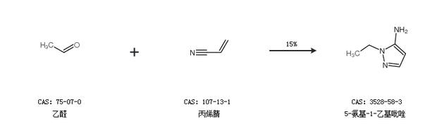 1.通过乙醛和丙烯腈合成5-氨基-1-乙基吡唑,收率约15%;