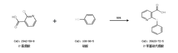 1.通过2-氯烟酸和硫酚合成2-苯基硫代烟酸,收率约99%;