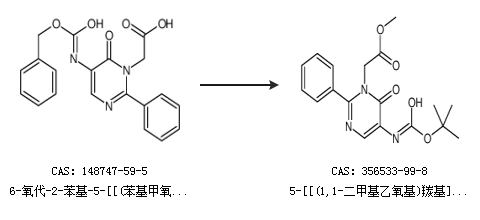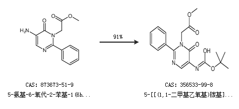 2.通过5-氨基-6-氧代-2-苯基-1(6h)-嘧啶乙酸甲酯合成5-[[(1,1-二甲基乙氧基)羰基]氨基]-6-氧代-2-苯基-1(6h)-嘧啶乙酸甲酯,收率约91%;