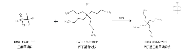 1.通过三氟甲磺酸和四丁基溴化铵合成四丁基三氟甲磺酸铵,收率约93%;