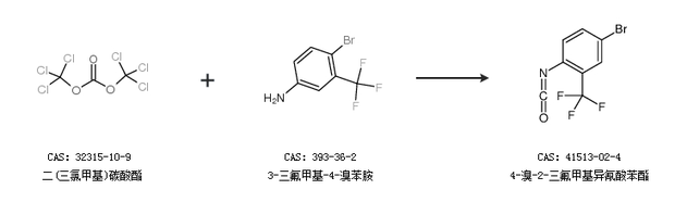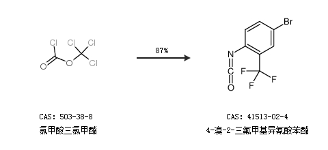 1.通过氯甲酸三氯甲酯合成4-溴-2-三氟甲基异氰酸苯酯,收率约87%;