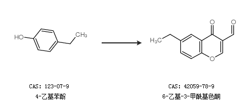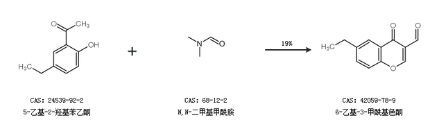 1.通过5-乙基-2-羟基苯乙酮和N,N-二甲基甲酰胺合成6-乙基-3-甲酰基色酮,收率约19%;