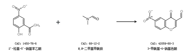 1.通过2''-羟基-5''-硝基苯乙酮和N,N-二甲基甲酰胺合成3-甲酰基-6-硝基色酮,收率约92%;