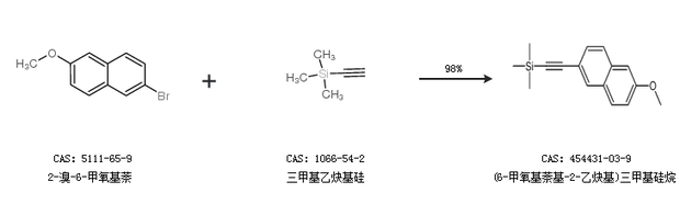 1.通过2-溴-6-甲氧基萘和三甲基乙炔基硅合成(6-甲氧基萘基-2-乙炔基)三甲基硅烷,收率约98%;