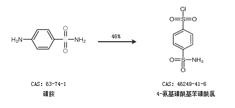 1.通过磺胺合成4-氨基磺酰基苯磺酰氯,收率约46%;