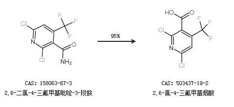 2.通过2,6-二氯-4-三氟甲基吡啶-3-羧胺合成2,6-氯-4-三氟甲基烟酸,收率约95%;