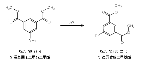 1.通过5-氨基间苯二甲酸二甲酯合成5-溴异肽酸二甲基酯,收率约89%;
