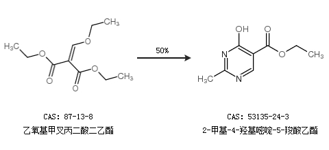 2.通过乙氧基甲叉丙二酸二乙酯合成2-甲基-4-羟基嘧啶-5-羧酸乙酯,收率约50%;