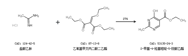 1.通过盐酸乙脒和乙氧基甲叉丙二酸二乙酯合成2-甲基-4-羟基嘧啶-5-羧酸乙酯,收率约27%;