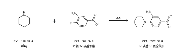1.通过哌啶和2-氟-5-硝基苯胺合成5-硝基-2-哌啶苯胺,收率约96%;