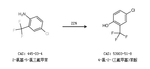 1.通过2-氨基-5-氯三氟甲苯合成4-氯-2-(三氟甲基)苯酚,收率约22%;