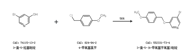 1.通过3-溴-5-羟基吡啶和4-甲氧基氯苄合成3-溴-5-(4-甲氧基苄氧基)吡啶,收率约56%;