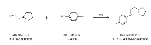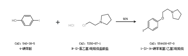 2.通过4-碘苯酚和N-(2-氯乙基)吡咯烷盐酸盐合成1-[2-(4-碘苯氧基)乙基]吡咯烷,收率约92%;