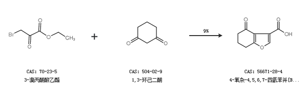 1.通过3-溴丙酮酸乙酯和1,3-环己二酮合成4-氧杂-4,5,6,7-四氢苯并[B]呋喃-3-羧酸,收率约9%;