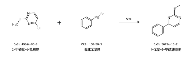 2.通过2-甲硫基-4-氯嘧啶和溴化苯基镁合成4-苯基-2-甲硫基嘧啶,收率约53%;