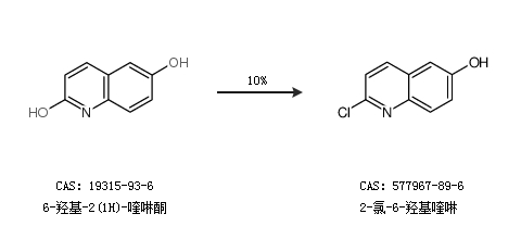 1.通过6-羟基-2(1H)-喹啉酮合成2-氯-6-羟基喹啉,收率约10%;