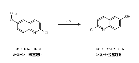 2.通过2-氯-6-甲氧基喹啉合成2-氯-6-羟基喹啉,收率约70%;