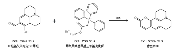 1.通过8-羟基久洛尼定-9-甲醛和甲氧甲酰基甲基三苯基溴化膦合成香豆素6H,收率约88%;