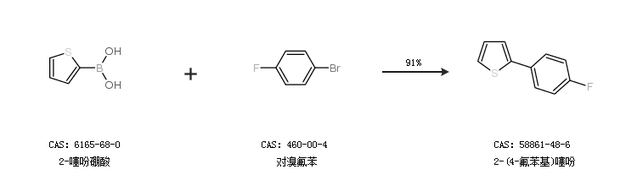 1.通过2-噻吩硼酸和对溴氟苯合成2-(4-氟苯基)噻吩,收率约91%;