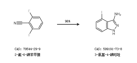 1.通过2-氟-6-碘苯甲腈合成3-氨基-4-碘吲唑,收率约96%;