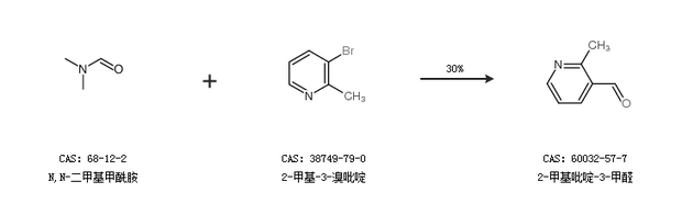 1.通过N,N-二甲基甲酰胺和2-甲基-3-溴吡啶合成2-甲基吡啶-3-甲醛,收率约30%;