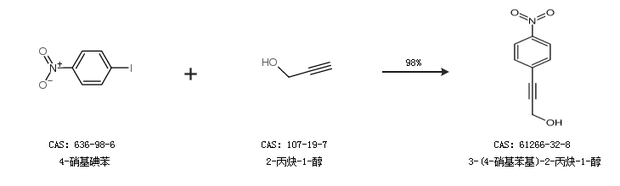 1.通过4-硝基碘苯和2-丙炔-1-醇合成3-(4-硝基苯基)-2-丙炔-1-醇,收率约98%;