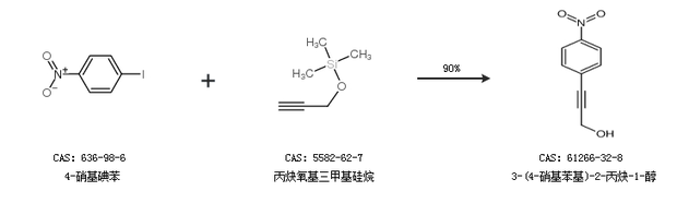 2.通过4-硝基碘苯和丙炔氧基三甲基硅烷合成3-(4-硝基苯基)-2-丙炔-1-醇,收率约90%;