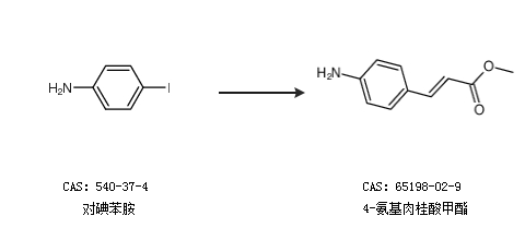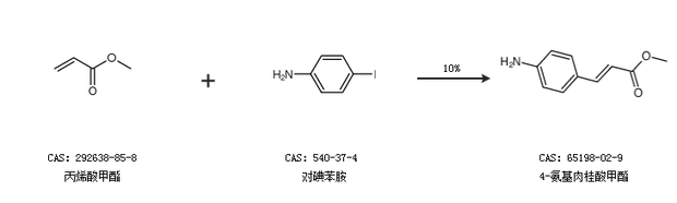 1.通过丙烯酸甲酯和对碘苯胺合成4-氨基肉桂酸甲酯,收率约10%;