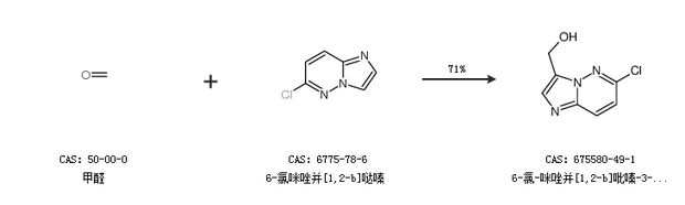1.通过甲醛和6-氯咪唑并[1,2-b]哒嗪合成6-氯-咪唑并[1,2-b]吡嗪-3-甲醇,收率约71%;