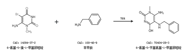 1.通过6-氨基-5-溴-1-甲基尿嘧啶和苯甲胺合成6-氨基-5-苄基氨基-1-甲基尿嘧啶,收率约76%;