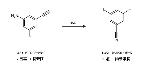 1.通过5-氨基-3-氟苯腈合成3-氟-5-碘苯甲腈,收率约45%;