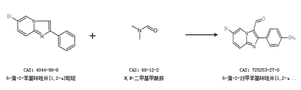 1.通过6-溴-2-苯基咪唑并[1,2-a]吡啶和N,N-二甲基甲酰胺合成6-溴-2-对甲苯基咪唑并[1,2-a]吡啶-3-羧醛