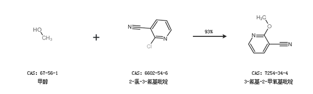 1.通过甲醇和2-氯-3-氰基吡啶合成3-氰基-2-甲氧基吡啶,收率约93%;