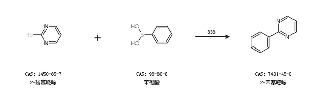 2.通过2-巯基哌啶和苯硼酸合成2-苯基嘧啶,收率约83%;