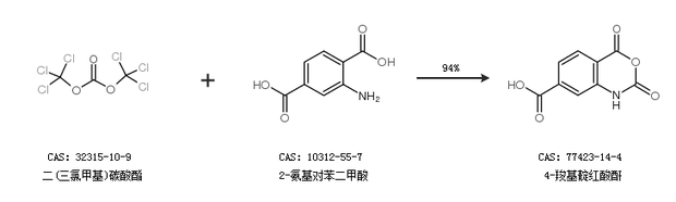 1.通过二(三氯甲基)碳酸酯和2-氨基对苯二甲酸合成4-羧基靛红酸酐,收率约94%;