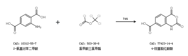 2.通过2-氨基对苯二甲酸和氯甲酸三氯甲酯合成4-羧基靛红酸酐,收率约74%;