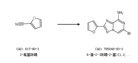 1.通过2-氰基呋喃合成6-溴-2-(呋喃-2-基)[1,2,4]噻唑并[1,5-a]吡嗪-8-胺