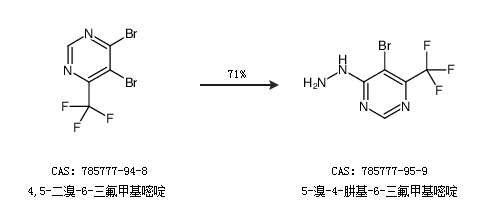 1.通过4,5-二溴-6-三氟甲基嘧啶合成5-溴-4-肼基-6-三氟甲基嘧啶,收率约71%;