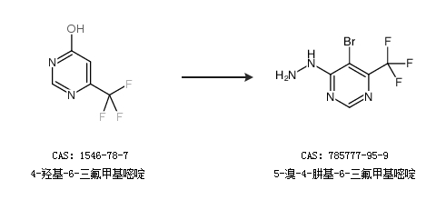 2.通过4-羟基-6-三氟甲基嘧啶合成5-溴-4-肼基-6-三氟甲基嘧啶
