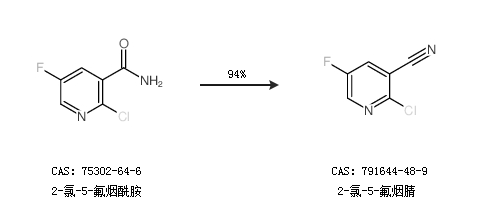 1.通过2-氯-5-氟烟酰胺合成2-氯-5-氟烟腈,收率约94%;