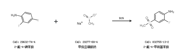 1.通过2-氟-4-碘苯胺和甲烷亚磺酸钠合成2-氟-4-甲砜基苯胺,收率约91%;