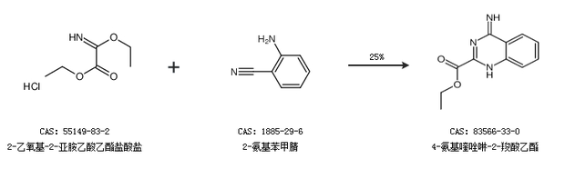 1.通过2-乙氧基-2-亚胺乙酸乙酯盐酸盐和2-氨基苯甲腈合成4-氨基喹唑啉-2-羧酸乙酯,收率约25%;