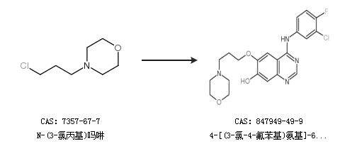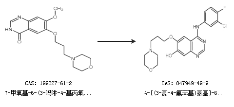 中文别名 7-羟基喹唑啉,4-[(3-氯-4-氟苯基)氨基]-6-[3-(4-吗啉基)丙氧基];O-去甲吉非替尼;氧位O-脱甲基吉非替尼;