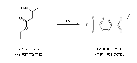 1.通过3-氨基巴豆酸乙酯合成6-三氟甲基烟酸乙酯,收率约35%;