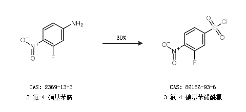 1.通过3-氟-4-硝基苯胺合成3-氟-4-硝基苯磺酰氯,收率约60%;